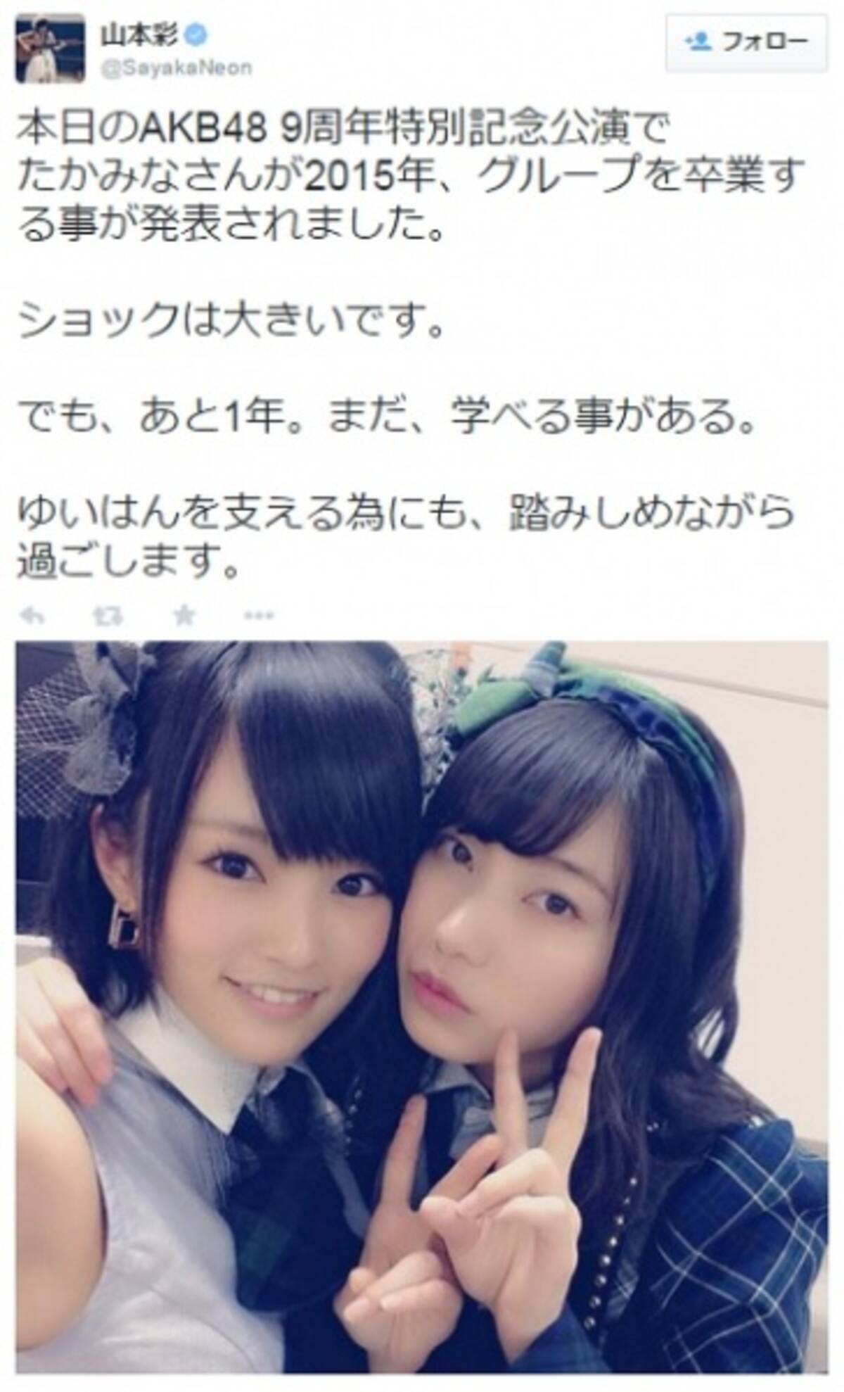 山本彩は めちゃイケ 効果でたかみなの卒業発表に耐えられた どっきりで覚悟が出来てた 14年12月11日 エキサイトニュース